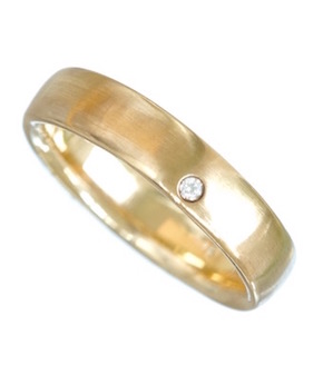 A heavy 9k yellow gold ring punch set with 1 x 2mm round diamond with a brush finish. Shank 5mm.